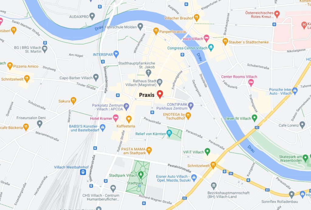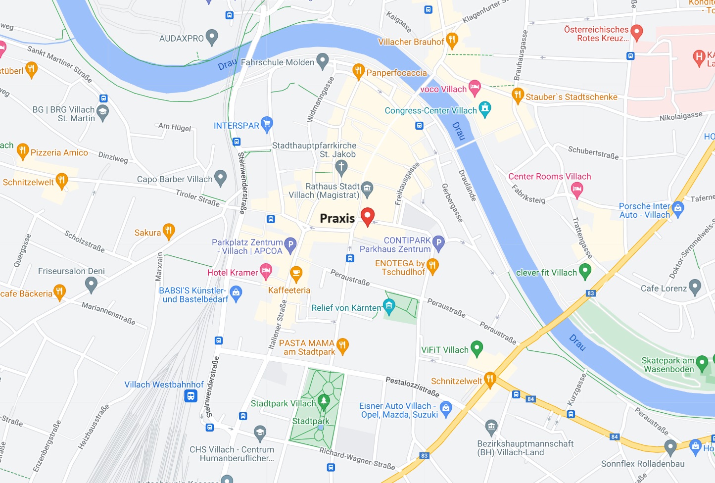 Die Praxis befindet sich nahe dem Hauptplatz in Villach, im Alten Parkhotel in der Moritschstraße 2. Sie finden mich im 4. Stock, den Sie bequem über den Lift oder über eine Treppe erreichen können.